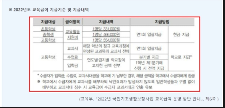 초등학생은 1명당 331,000원, 중학생 1명당 466,000, 고등학생 1명당 554,000원 연 1회 현금 지급. 고등학생이라면 교과서 연 1회 일괄, 수업료는 분기별, 입학금은 전액 지급