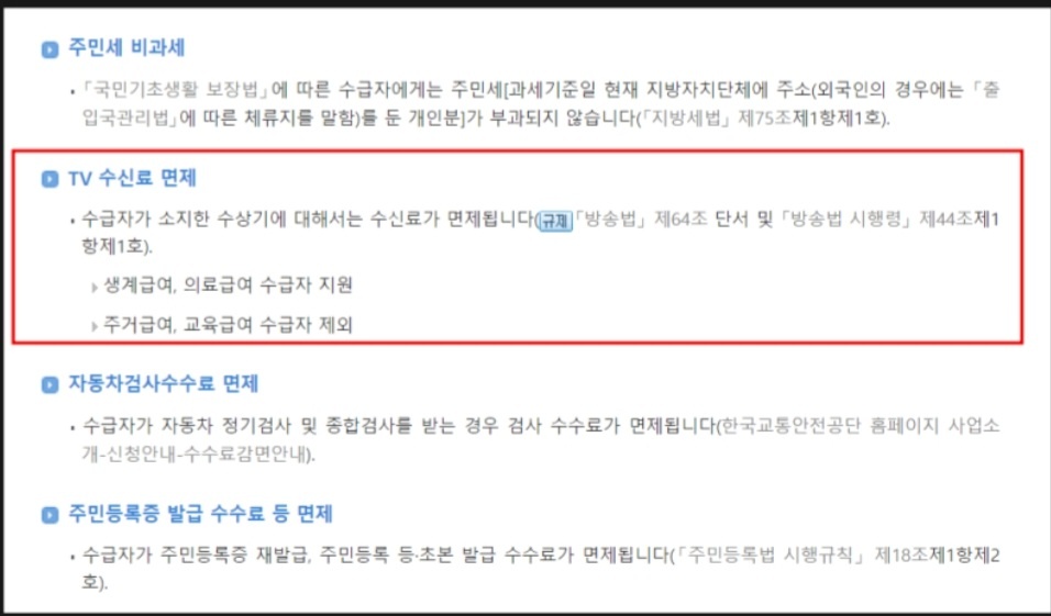 주민세 비과세, TV수신료 면제, 자동차검사수수료 면제, 주민등록증 발급 수수료 등 면제를 받을 수 있는데 TV수신료의 경우 교육, 주거급여 수급자는 제외된다. 이외에도 전기요금, 상하수도 요금감면, 종량제 폐기물 수수료 감면, 에너지 바우처 등도 지급받을 수 있습니다..