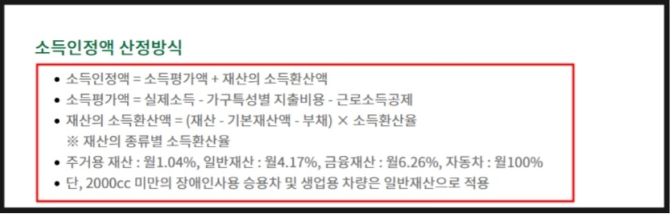 2) 재산의 소득환산액= (재산-부채-기본재산액)*소득환산율-주거용 재산은 소득환산율 월 1.04%, 일반재산 4.17%, 금융재산 6.26% 자동차 100%