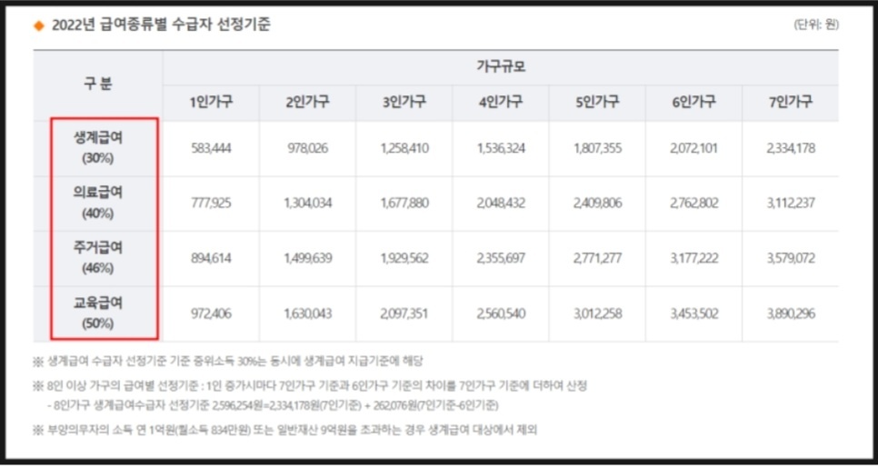 ● 생계 30% , 의료 40% , 주거 46% , 교육 50%입니다. 예를 들어서 2인 가구 기준 생계급여기준 978,026원에 미달한다면 수급자가 될 수 있습니다.