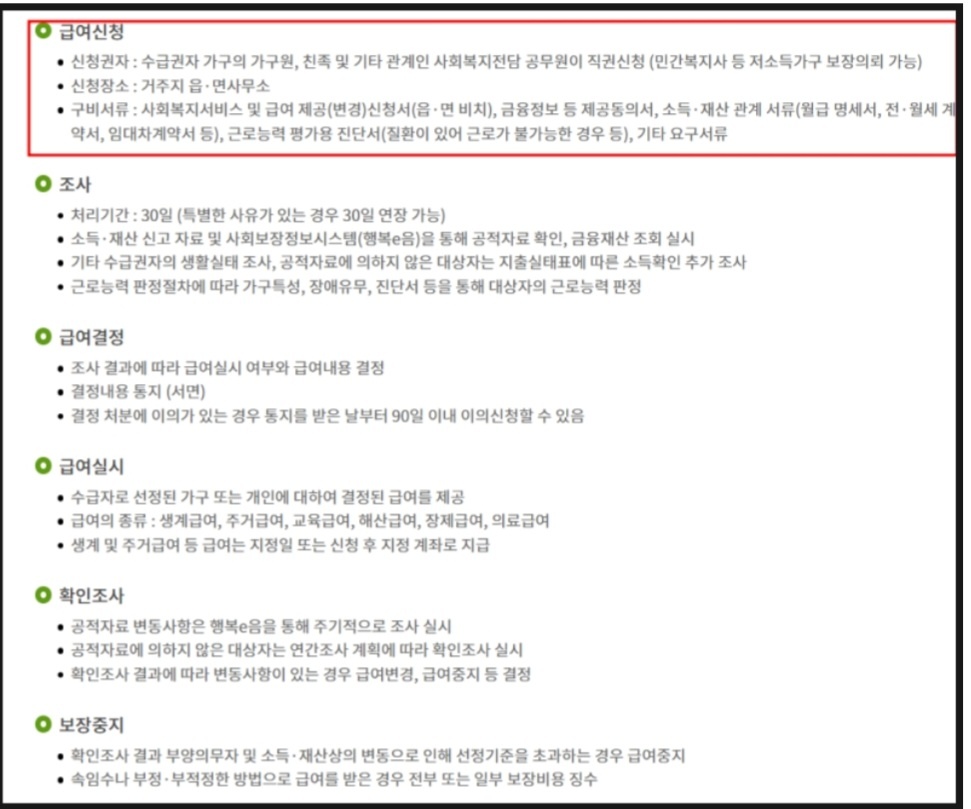 수급권자의 가구원이나 친족 혹은 기타 관계인 사회복지전담 공무원이 직권 신청을 함. 보통은 30일 이내로 처리되며 급여 결정은 빠르게 나는 편임. 급여결정통보는 주민센터에서 민원인에게 통보함.