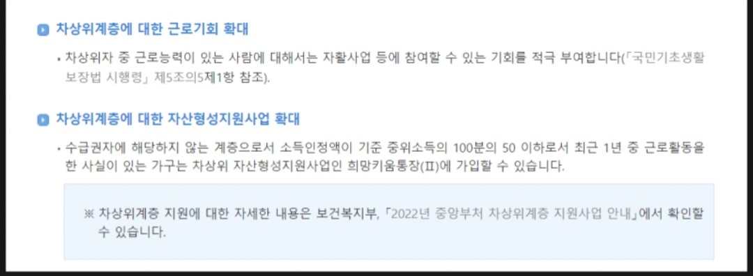 ①차상위자 중에서 근로능력이 있는 사람이라면 국민기초생활보장법 시행력에 따라 자활사업에 참여할 수 있는 기회를 부여함 ②자산형성 지원사업으로 희망키움 통장 || 사업에 지원 가능함