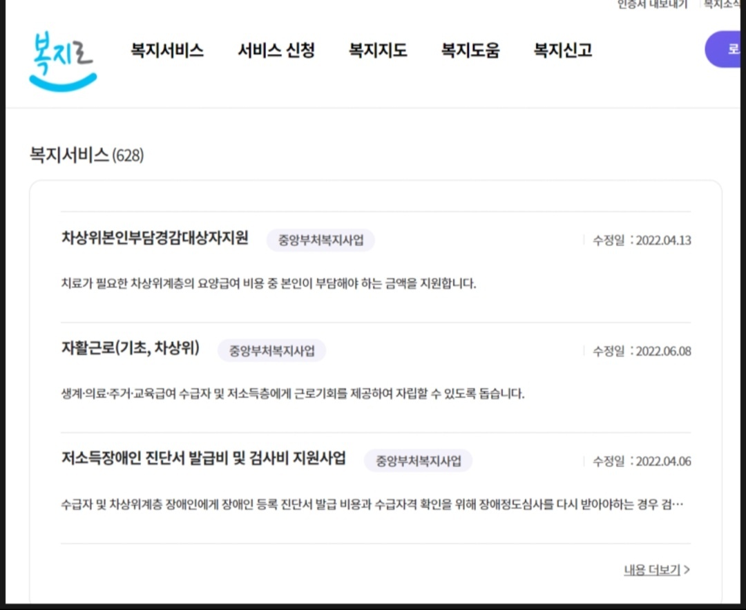 복지서비스란을 누르면 다양한 서비스를 체크할 수 있습니다. 본인부담 경감대상자 지원, 저소득 장애인 진단서 발급비 및 검사비 지원 사업 등도 있습니다.