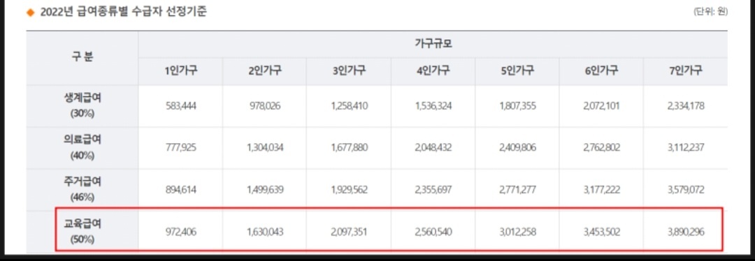 ●가구에 따른 중위소득 금액의 50%를 곱함