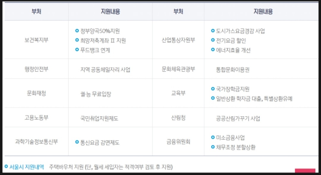 ①보건복지부 사업으로 정부양곡 50% 지원, 푸드뱅크 연계 ②행안부 사업으로 지역공동체 일자리 사업 ③문화재청 궐, 능 무료입장 ④ 고용노동부 국민 취업지원제도 지원 ⑤과기부 통신요금 감면제도 ⑥ 사업 통산 자원부 전기요금할인, 에너지 효율 개선, 도시가스요금 경감 사업 ⑦ 문체부 통합문화이용권 지원사업 ⑧ 교육부 국가장학금 지원, 일반상환 학자금 대출, 특별상환유예 ⑨ 산림청 공공산림 가꾸기 사업 ⑩ 금융위원회 미소금융사업, 채무조정분할상환 ※ 그 외 서울시에서는 주택바우처 지원 사업도 진행하고 있음.