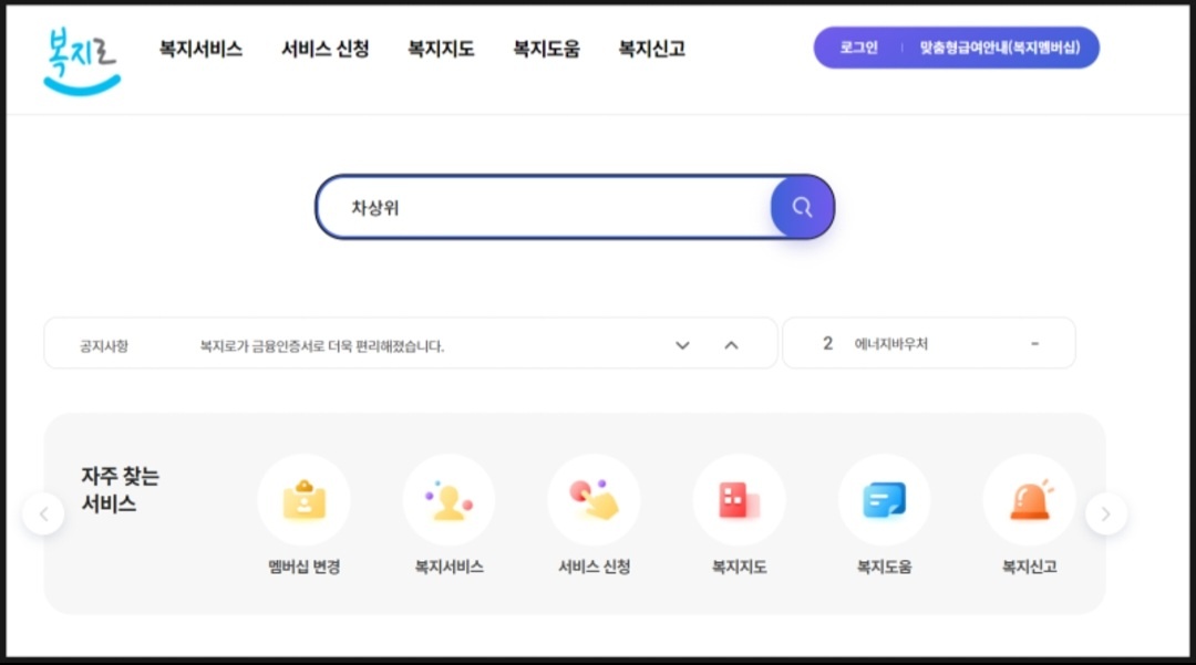 복지로 사이트에 들어가서 차상위라고 검색을 합니다.