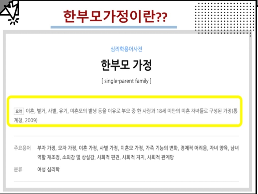 한부모가정은 이혼,별거,사별,유기,미혼모의 발생 등을 이유로 부모 중 한 사람과 18세 미민의 미혼자녀들로 구성된 가장을 의미합니다. 양육자 중 한쪽만 있는 것으로 아버자, 어머니 한 분만 있는 세대를 의미합니다.