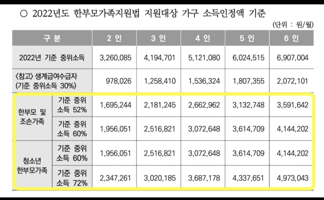 2022년 한부모가정 자격은 18세미민의 미혼의 자녀가 있는 한부모 가정인 것 이외에 소득기준이 있는데 소득인정액이 중위소득의 52~60% 이하여야 하는데 그에 따라 한부모가정은 2인 기준 1,695,244원 이하이며 청소년 한부모가족은 1,956,051원 이하의 소득액이어야 자격이 있습니다. 그 외의 인원수들에 따라 차이가 있으니 확인해 주세요.