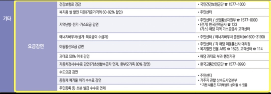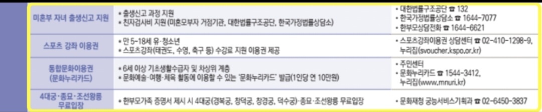 미혼모 자녀 출생신고 지원, 스포츠강좌 이용권, 통합문화이용권 4대 궁, 종묘 조선왕릉 무료입장 등의 혜택이 있습니다.요금감면으로는 건강보험,쌀, 지역난방, 전기, 가스요금, 통신요금, 과태료, 수도요금 등의 혜택이 있습니다.