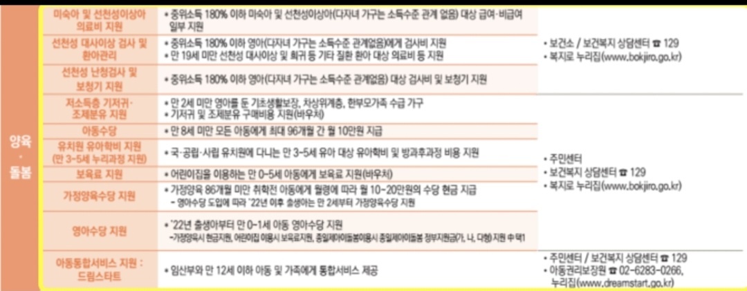 미숙아, 선천성 이상아 등의 검사 및 의료비를 지원받을 수 있고 선천성 난청의 경우 검사 및 보청기를 지원받을 수 있습니다. 또 조제분유, 유치원 학비, 보육료, 기저귀 등 의 다양한 혜택을 받을 수 있습니다. 지역아동센터, 가사와 간병 방문, 여성청소년 생리용품, 공동육아나눔터, 초등 돌봄 교실 등의 혜택도 받을 수 있습니다.