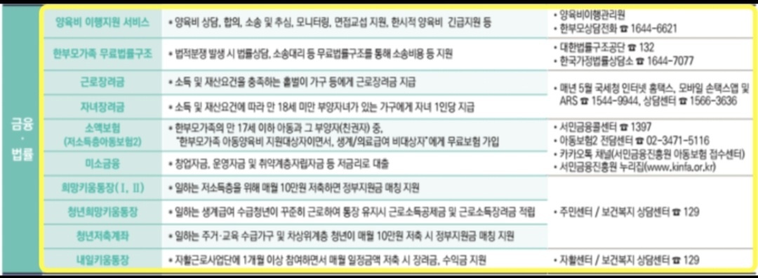 양육비 이행지원 서비스, 무료법률구조, 근로장려금, 자녀장려금, 소액보험, 미소금융, 희 밍키 움 통장, 청연 저축계좌 등의 혜택이 있습니다.