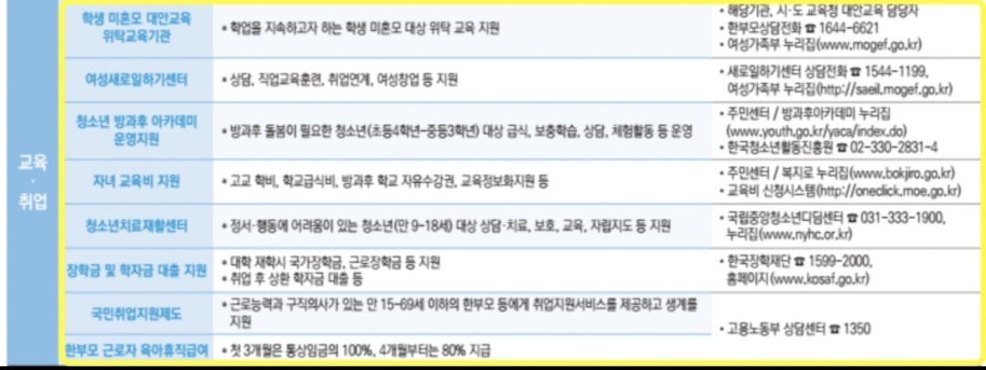 미혼모 위탁교육기관,여성새로일하기,청소년방과후 아카데미, 자녀 교육비, 장학금 및 학자금 대출, 국민 취업제도 등 의 혜택이 있습니다.
