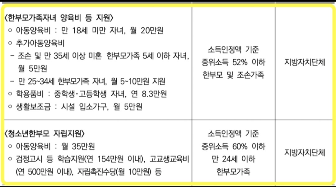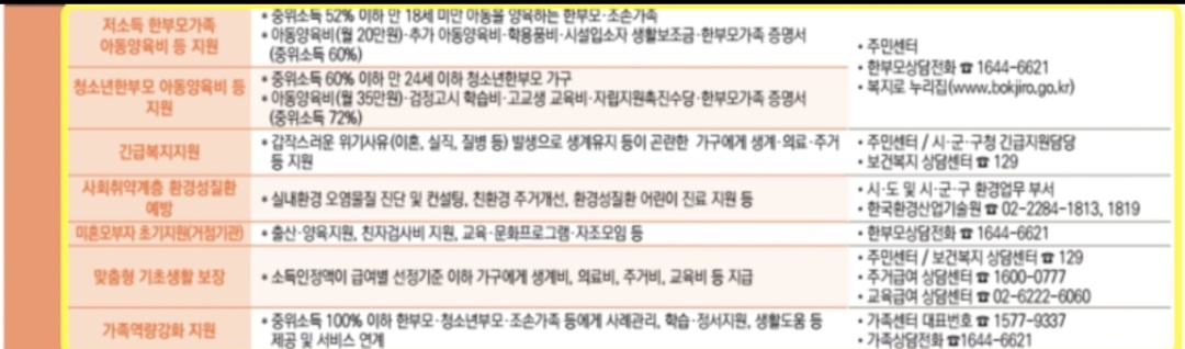 저소득 한부모가족,청소년한부모에 해당하면 아동양육비 지원을 받을 수 있고 그 외에도 긴급복지지원, 사회 취약계층 환경성질환 예방 등의 지원을 받을 수 있습니다.