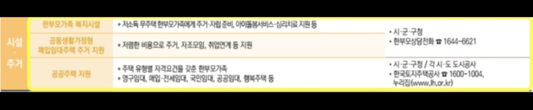 한부모가정은 복지시설,공동생활가정형 주거지원, 공공주택 지원을 받을 수 있습니다.