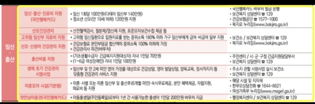 임신,출산에 해당하는 진료비를 지원받을 수 있으며 산모 건강관리, 고위험 임산부 의료비 지원, 산모와 신생아 건강관리 지원, 출산비용, 미혼모자 시설 등의 혜택이 있습니다.